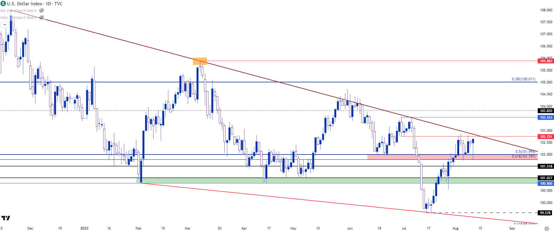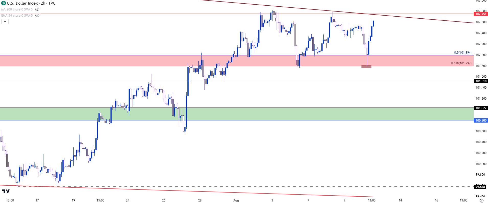 然而,回去的路并非一帆风顺,因为这种形态令价格进入一个熟悉的阻力区域,到目前为止,这个阻力区域还未破。我持续关注102.75点位附近,但上方还有看跌趋势线,今年到目前为止,美元多次遇阻。最近,这一趋势线在7月交易中引发了剧烈反转,导致年内新低的出现。而无独有偶,正是上个月的CPI数据真正导致了大跌;但空头无力为继,多头已经接管局面。