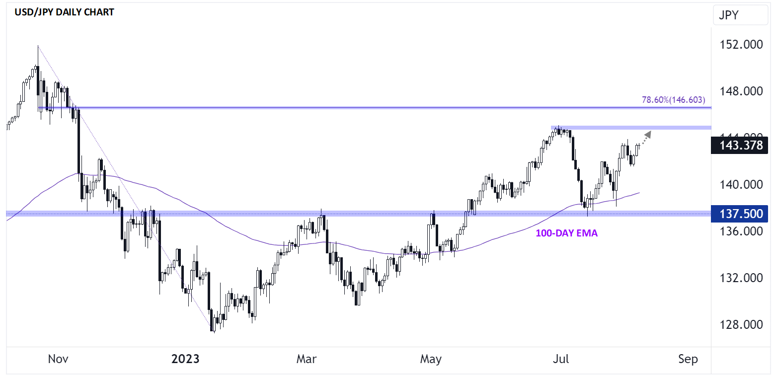 如上图所示,美元/日元交投于143.00上方,且正接近7月初的145.00高点。如果这一货币对能够超越上周的143.80高点,那么它很有可能会再次测试这一关键水平,乃至于接触从2022年10月到2023年1月的78.6%斐波那契回撤位于146.60。