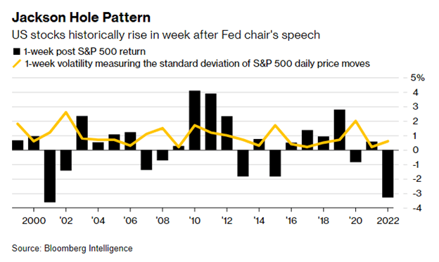 下图显示在过去22年,大部分情况下标普500指数能在杰克逊霍尔会议之后的一周录得涨幅。