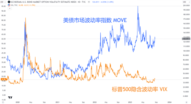 美债市场的波动率的上升(下图)是否会传导至美股市场?目前恐慌指数VIX已经升至3个月高点17%,不过仍低于去年会议期间的25%。