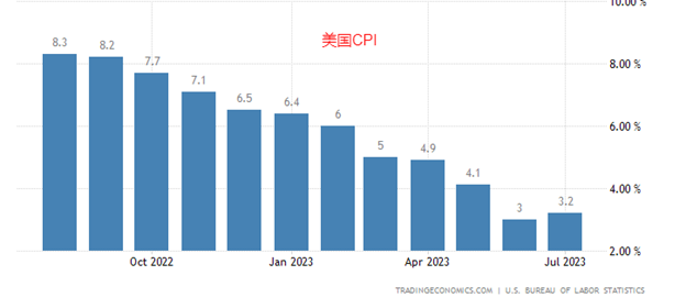 自2022年3月以来,美联储通过11次加息已经将当时的零利率提升至目前的5.25%-5.5%区间,其直接作用就是将通胀从9.1%的峰值压低到目前的3.2%(下图),不过也一定程度引发了经济放缓甚至衰退的担忧。